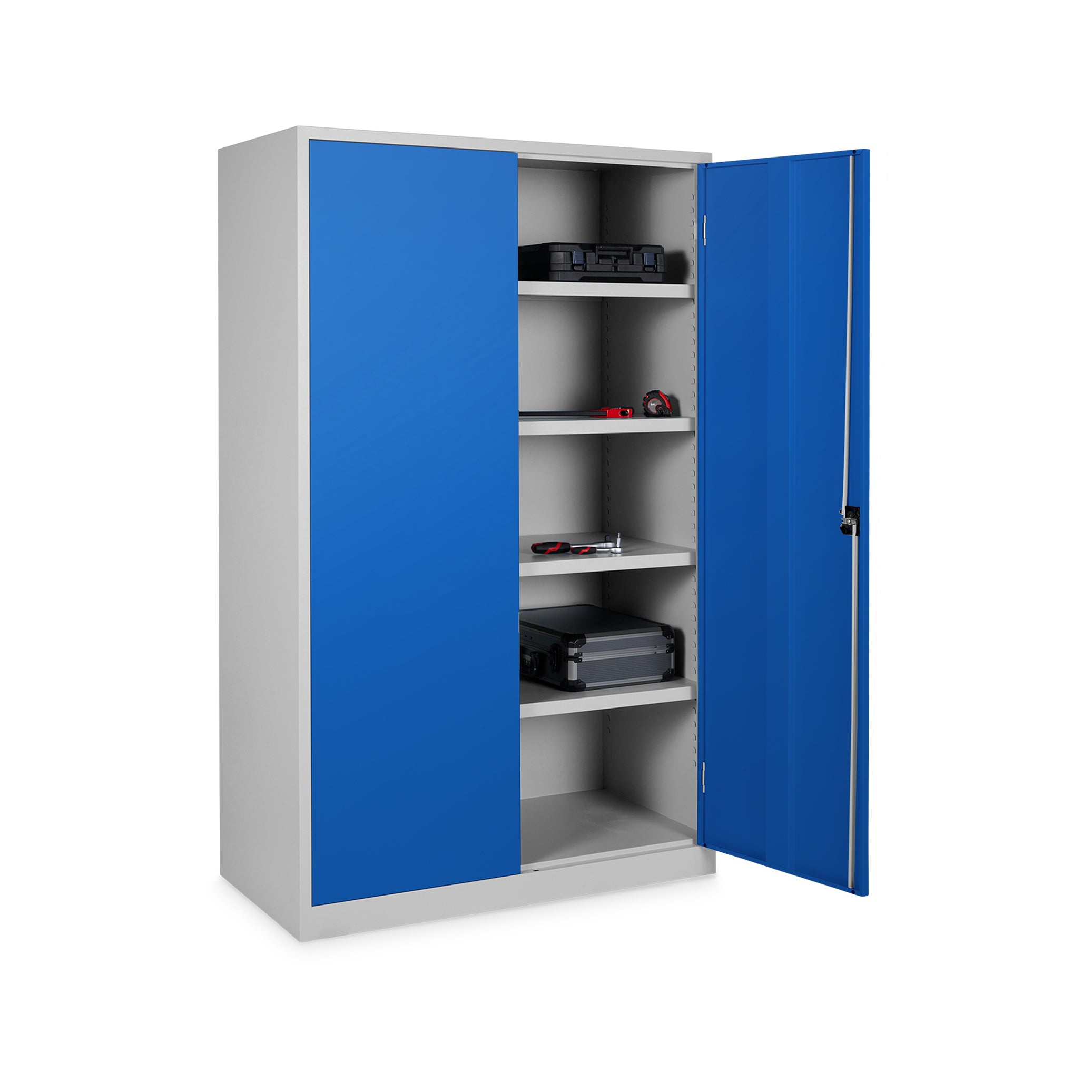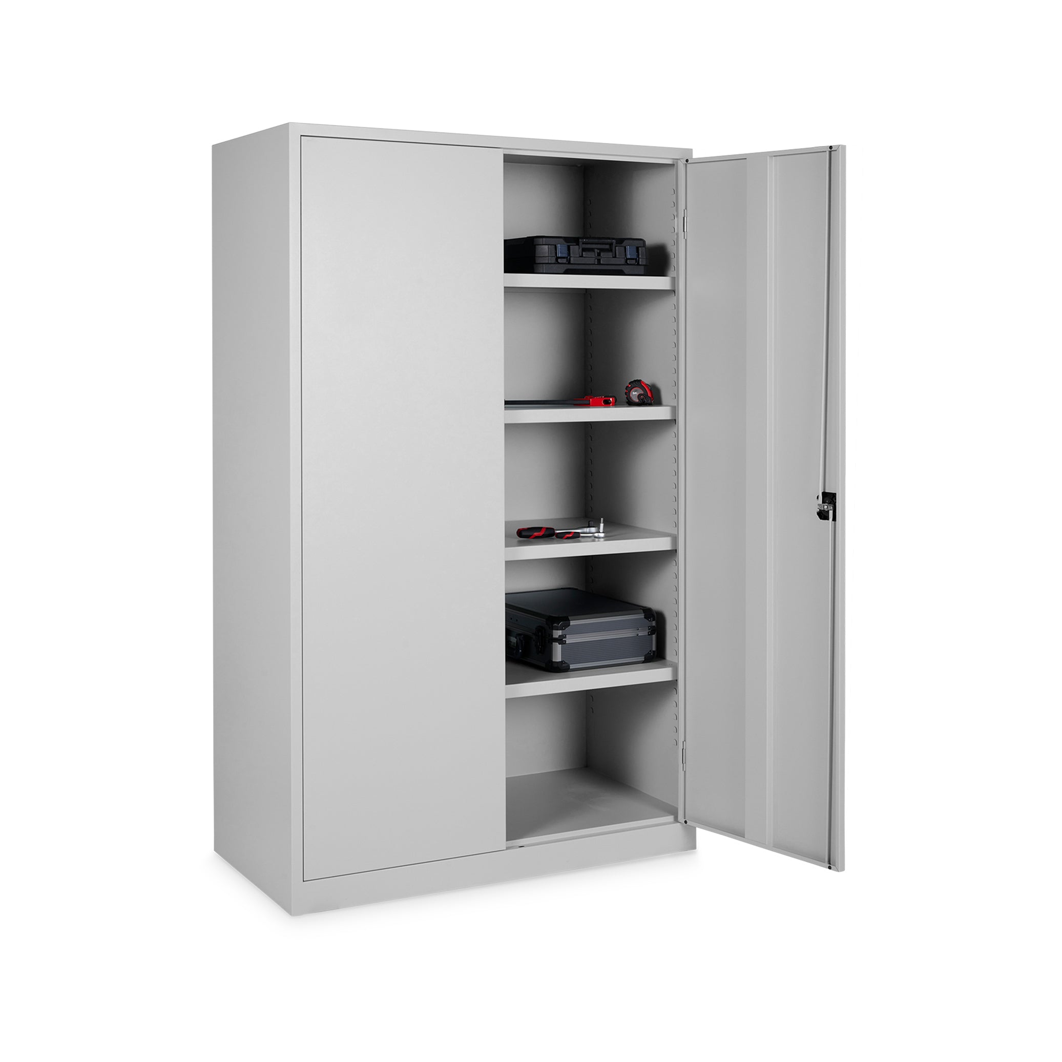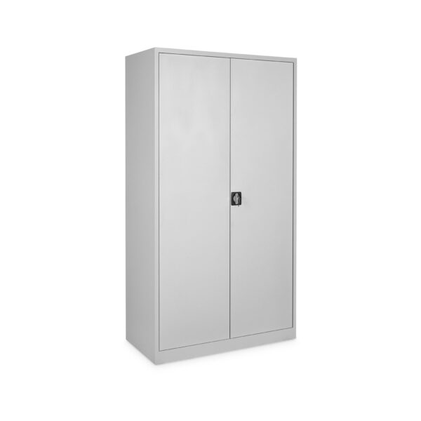 Der Schrank verfügt über 4 Fachböden, die im Raster von 35 mm höhenverstellbar sind und jeweils eine Traglast von bis zu 60 kg bieten. Der Schrank hat eine Höhe von 5 OH. Die verstärkten Flügeltüren (180° Türöffnung) sind mit geräuschdämpfenden Gummipuffern ausgestattet und schließen sicher durch ein Drehzylinderschloss.