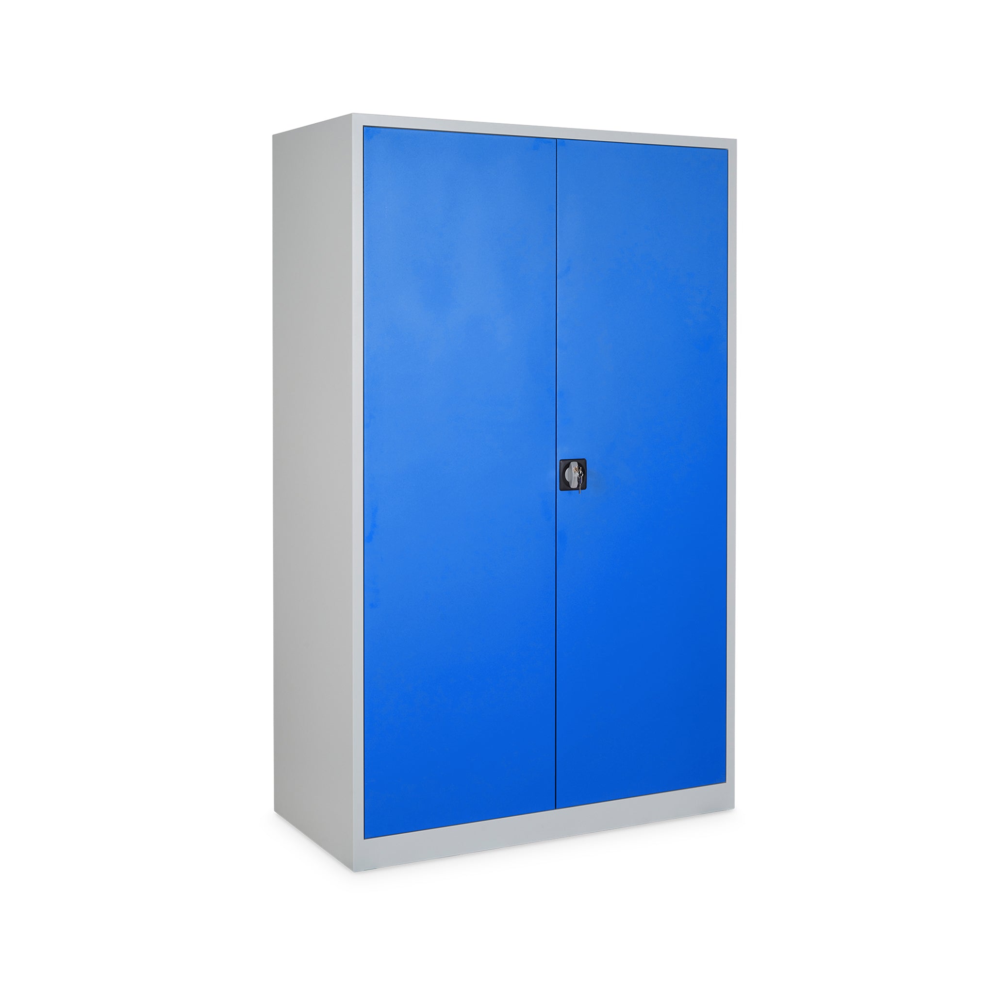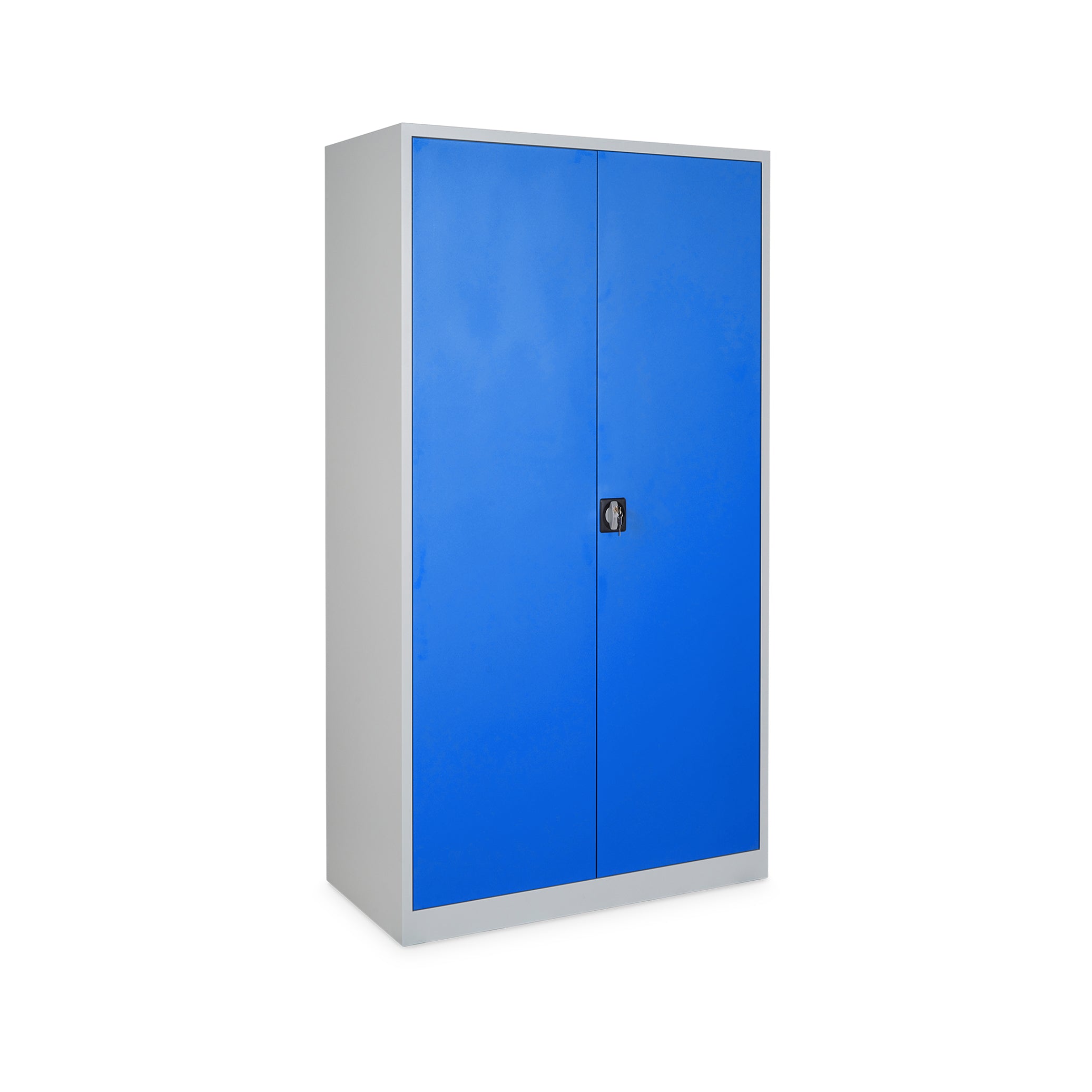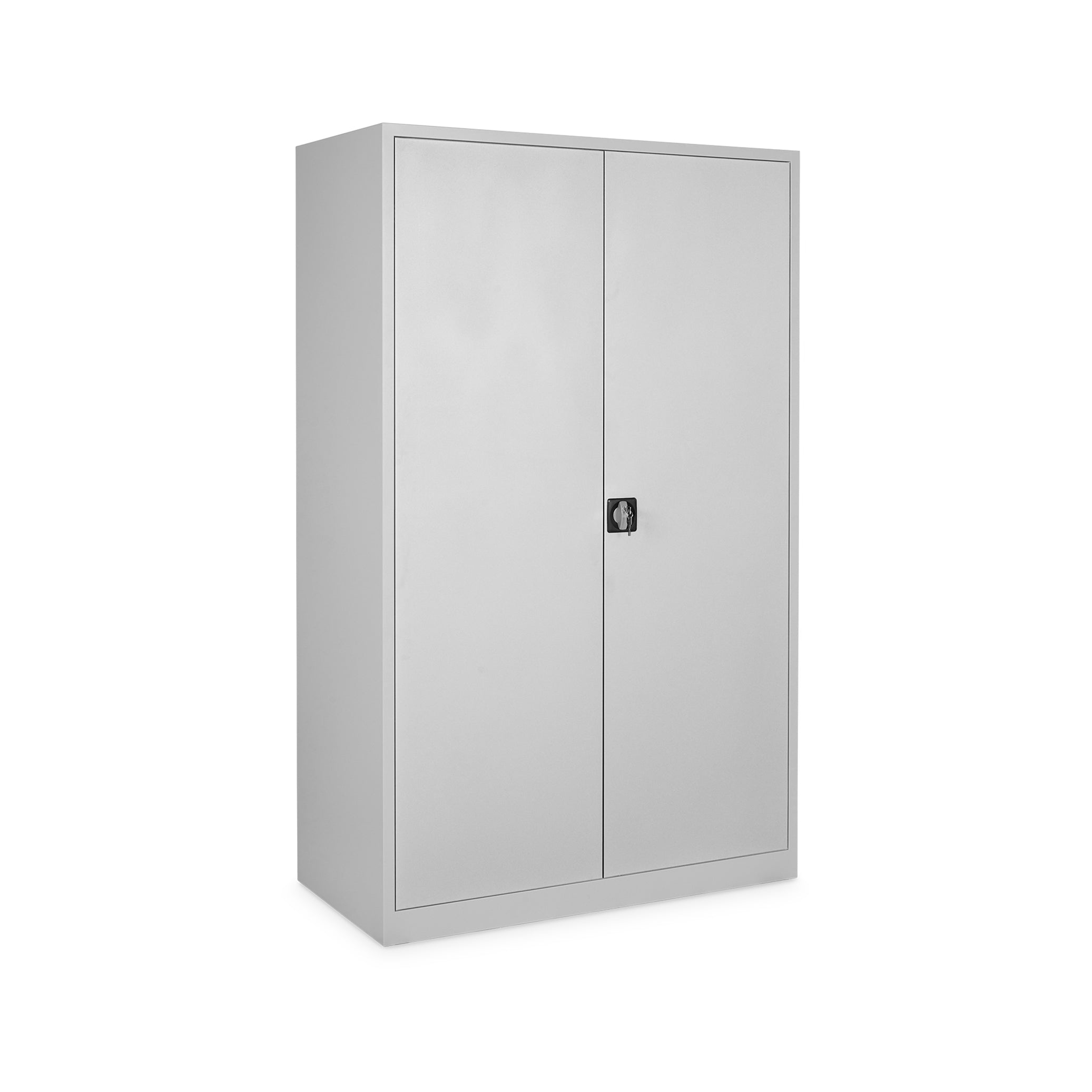 Der Schrank verfügt über 4 Fachböden, die im Raster von 35 mm höhenverstellbar sind und jeweils eine Traglast von bis zu 60 kg bieten. Der Schrank hat eine Höhe von 5 OH. Die verstärkten Flügeltüren (180° Türöffnung) sind mit geräuschdämpfenden Gummipuffern ausgestattet und schließen sicher durch ein Drehzylinderschloss.